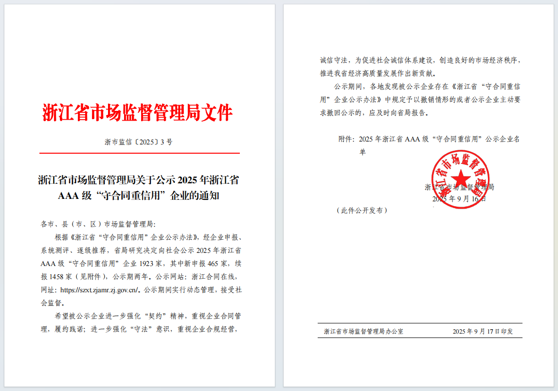 “守合同重信用”企业公示是浙江省市场监管系统对企业合同信用管理、履约能力、社会信誉等方面的权威认定。AAA级为该评定的最高等级,代表企业在诚信经营、合规管理、社会责任等方面处于行业领先水平。